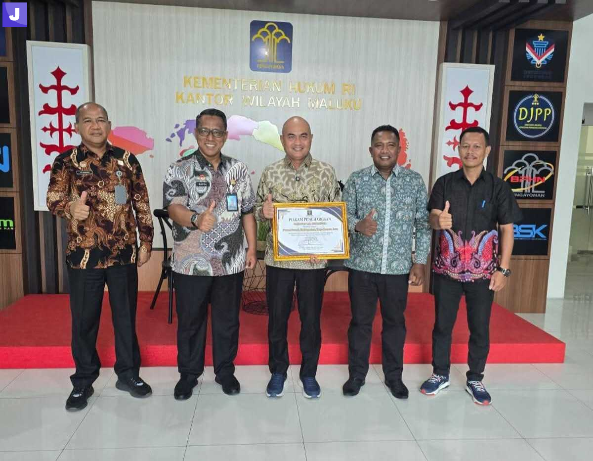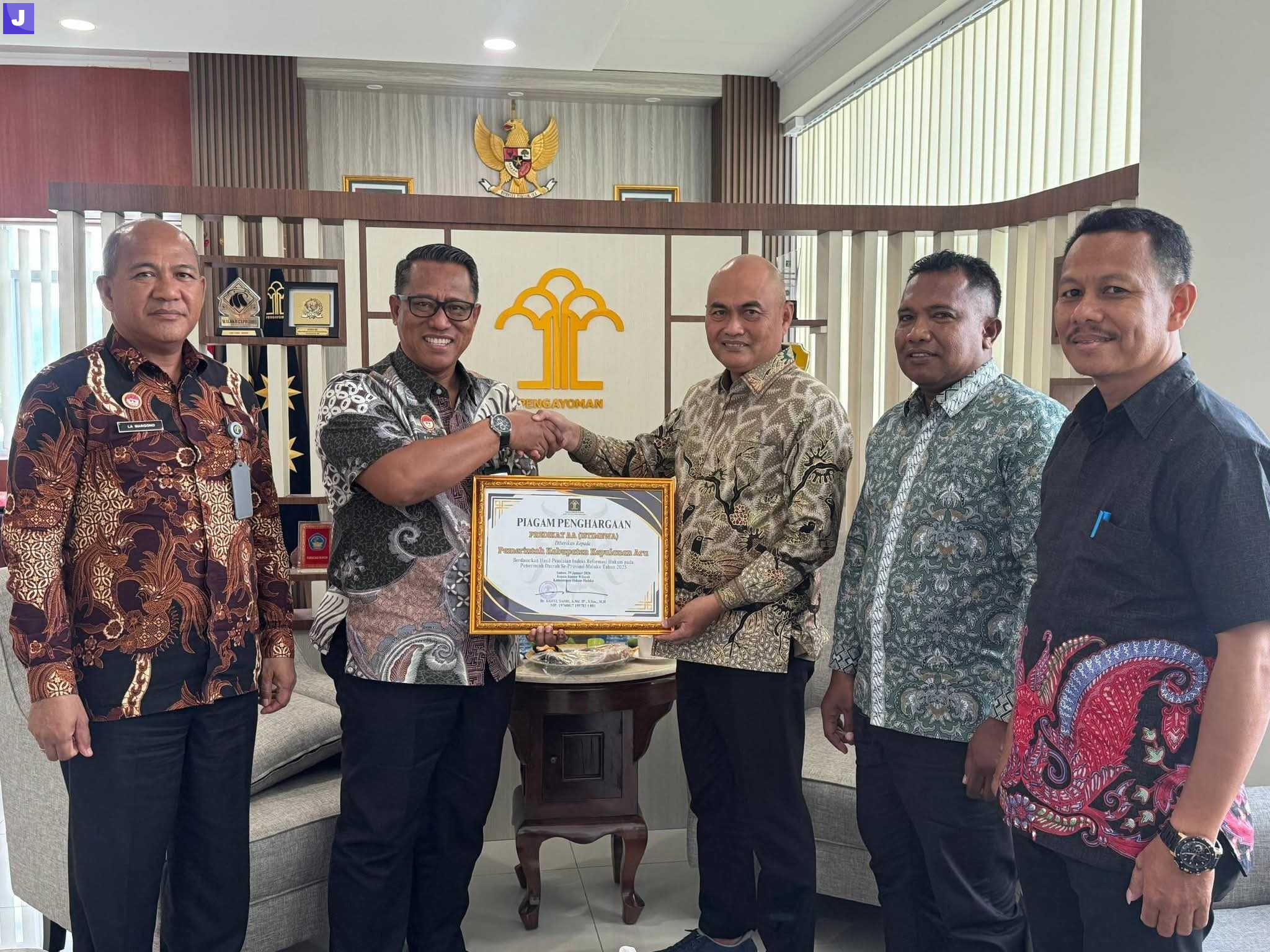 Penghargaan bergengsi tersebut diserahkan langsung oleh Kepala Kantor Wilayah Kementerian Hukum Maluku kepada Bupati Kepulauan Aru, Timotius Kaidel, dalam pertemuan resmi yang berlangsung di Kanwil Kemenkum Maluku, Kamis (5/1).