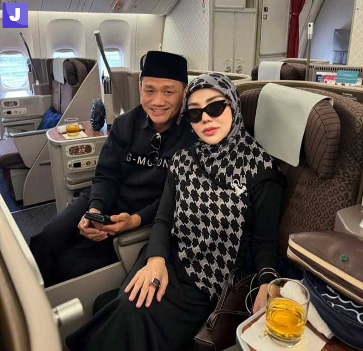 Tiga flyer foto yang diunggah, keduanya makin mesra di atas pesawat, sambil menikmati juice aple. Dua flyer berikut keduanya berselfie di ruang tunggu vvip bandara, dan tiga flyer foto lainnya, pasangan suami istri yang komplit, pengusaha dan aktris (penyanyi) itu berpose dengan 14 jamaah yang akan mengikuti Umroh.
