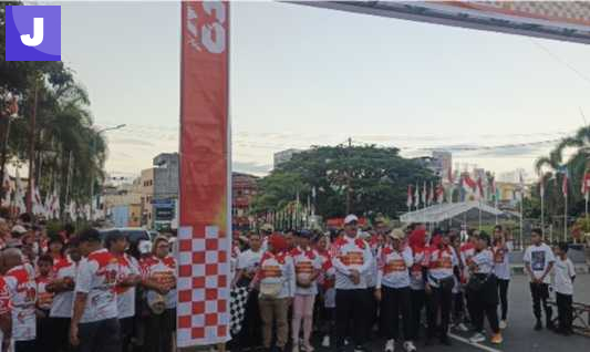 Warna merah putih mendominasi jalanan, mengalir seperti arus kebersamaan dalam kegiatan jalan santai memperingati Hari Ulang Tahun (HUT) ke-18 Partai Gerindra di Provinsi Maluku.
