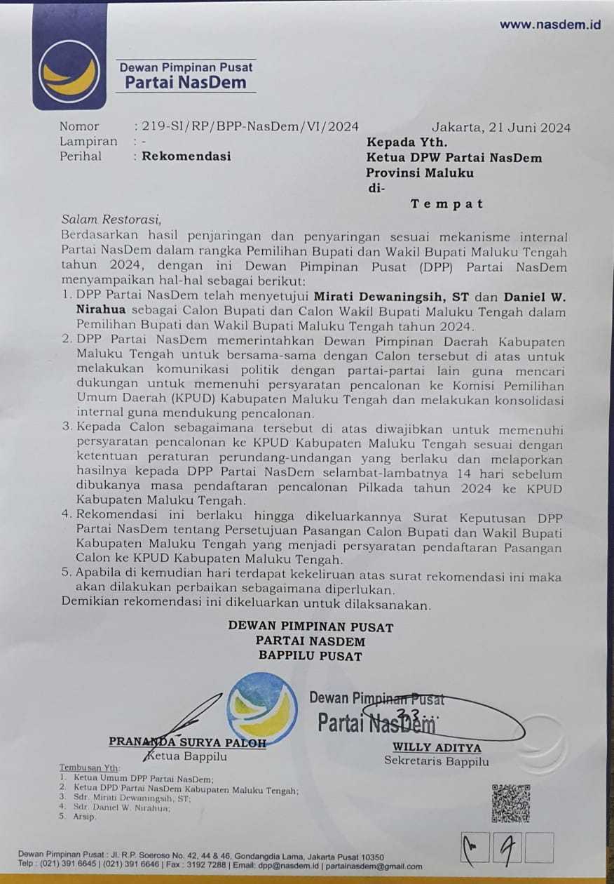 Dalam surat rekomendasi yang diterima media ini, Nomor: 219-SI/RP/BPP-NasDem/VI/2024 tertanggal 21 Juni 2024 ditujukan kepada DPW NasDem Provinsi Maluku dan ditandatangani Ketua dan Sekretaris Bappilu DPP Partai Nasdem Prananda Surya Paloh dan Willy Aditya.