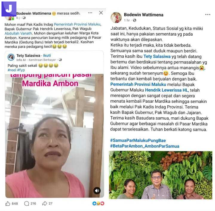 Sebagai gantinya, muncul unggahan baru. Kali ini bernada lebih teduh. Bodewin Wattimena membagikan momen pertemuannya dengan Tety Salasiwa. Ia menuliskan refleksi tentang jabatan dan kehidupan, sembari menyampaikan bahwa sang pedagang kini telah tersenyum kembali dan diharapkan bisa melanjutkan usahanya.